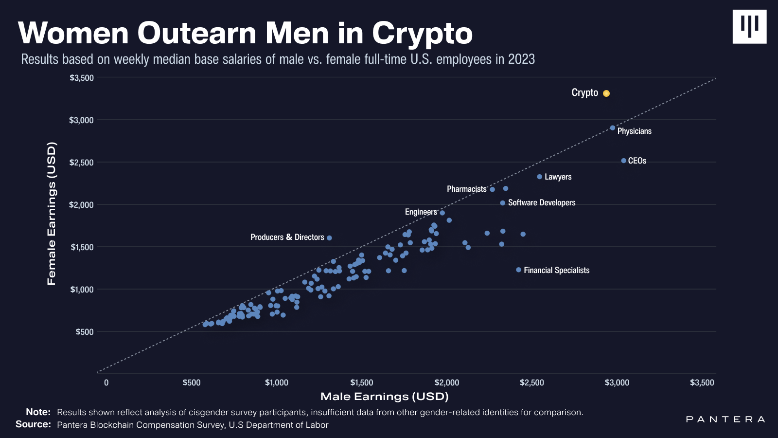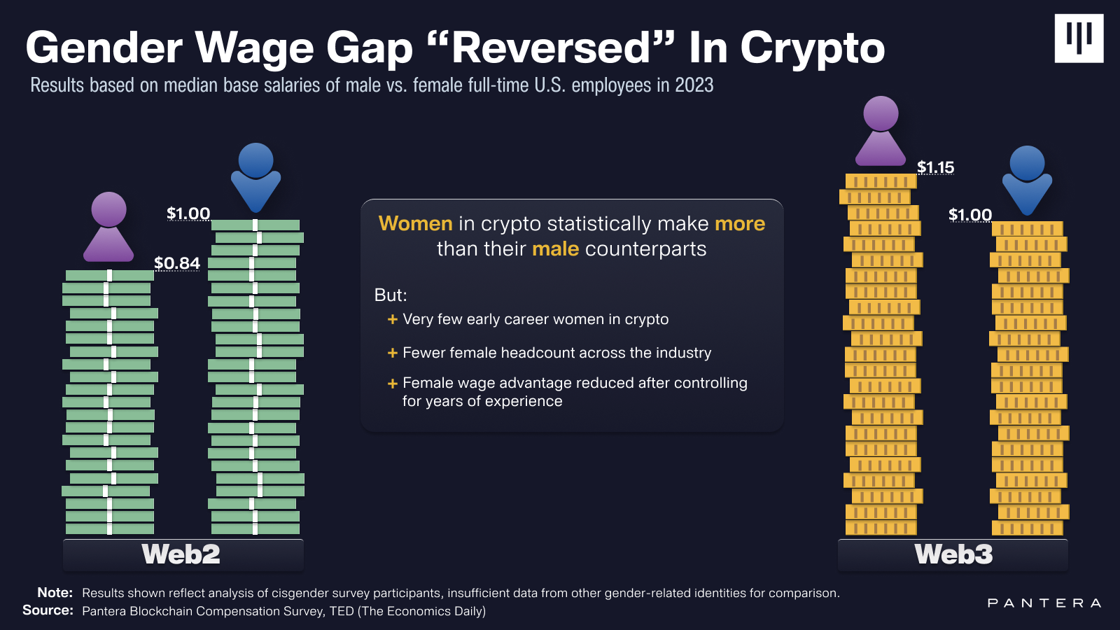 Nhóm nghiên cứu của Pantera, gồm Matt Stephenson, Ally Zach và Nick Zurck, giải thích vào ngày 29 tháng 7: “Phân tích của chúng tôi cho thấy sự chênh lệch lương theo giới tính giữa các nhân viên crypto là ngược lại so với những gì thường thấy.”
