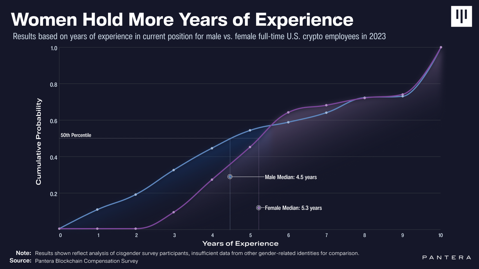 Mức lương cao hơn của phụ nữ có thể một phần là do phụ nữ có nhiều kinh nghiệm hơn tại các công ty crypto, với thời gian trung bình là 5.3 năm so với 4.5 năm của nam giới.