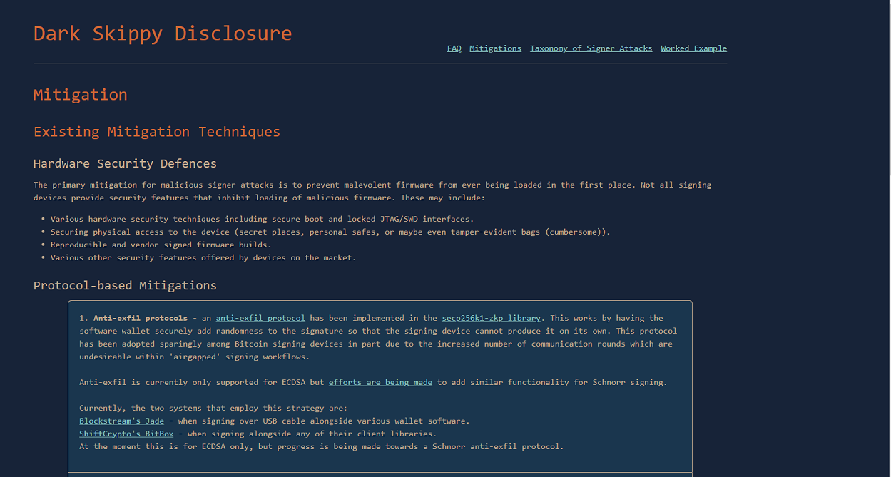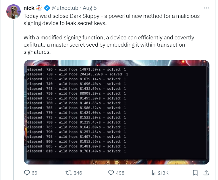 Các nhà nghiên cứu bảo mật đã phát hiện một phương pháp đáng lo ngại mà tin tặc có thể sử dụng để trích xuất khóa riêng từ ví cứng Bitcoin chỉ bằng cách ký hai giao dịch, phương pháp này được gọi là “Dark Skippy.”