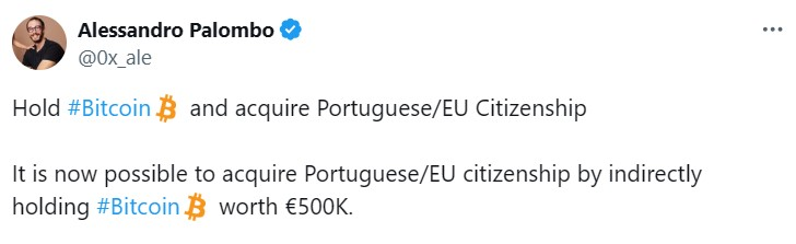 Trong một bài đăng trên X, Alessandro Palombo, đồng sáng lập và CEO của Unbound Fund, đã công bố khả năng đạt được quyền công dân Bồ Đào Nha thông qua việc đầu tư vào Bitcoin