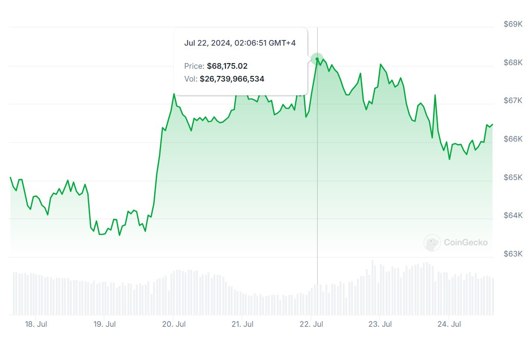 Tuy nhiên, vào ngày 24 tháng 7, giá BTC đã giảm nhanh chóng xuống còn 65.550 đô la trước khi hồi phục. Theo dữ liệu từ CoinGecko, hiện tại tài sản này đang ở mức 66.404 đô la.