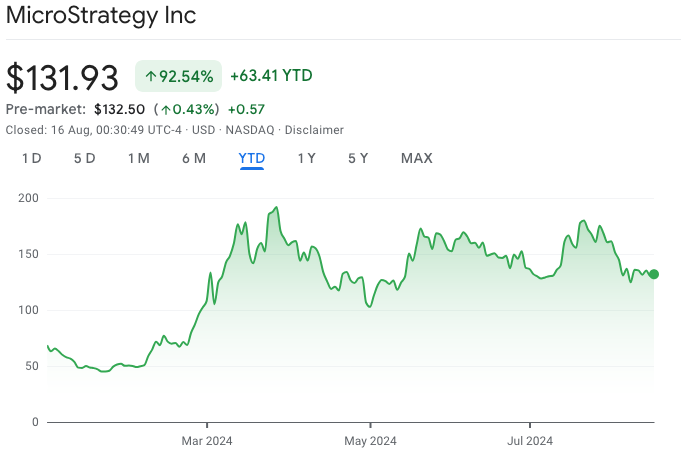 Trong khi đó, cổ phiếu MicroStrategy đã tăng 92,5% tính đến thời điểm hiện tại trong năm 2024, vượt mốc 150 USD lần đầu tiên sau hơn 24 năm, theo Google Finance.
