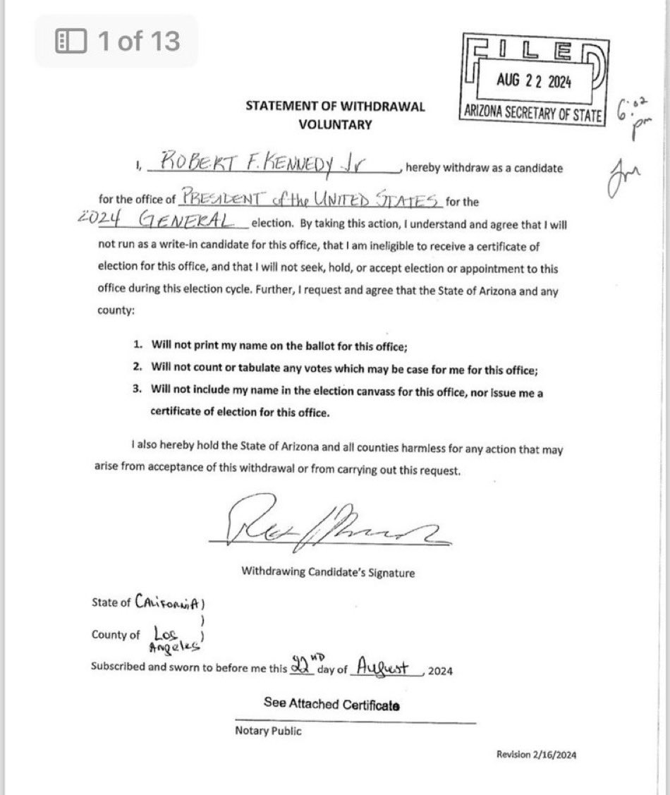 RFK Jr. rút khỏi cuộc đua tổng thống. Nguồn: Bộ trưởng Bộ Ngoại giao Arizona