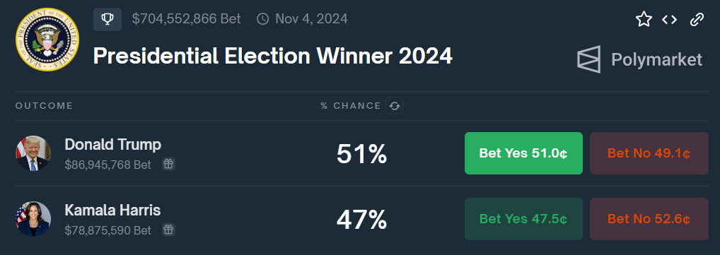 Theo dữ liệu từ Polymarket, 51% người dùng đang đặt cược vào việc Trump chiến thắng cuộc bầu cử tại thời điểm bài viết được xuất bản, trong khi chỉ có 47% tin rằng ứng cử viên tổng thống của Đảng Dân chủ Kamala Harris có cơ hội chiến thắng.