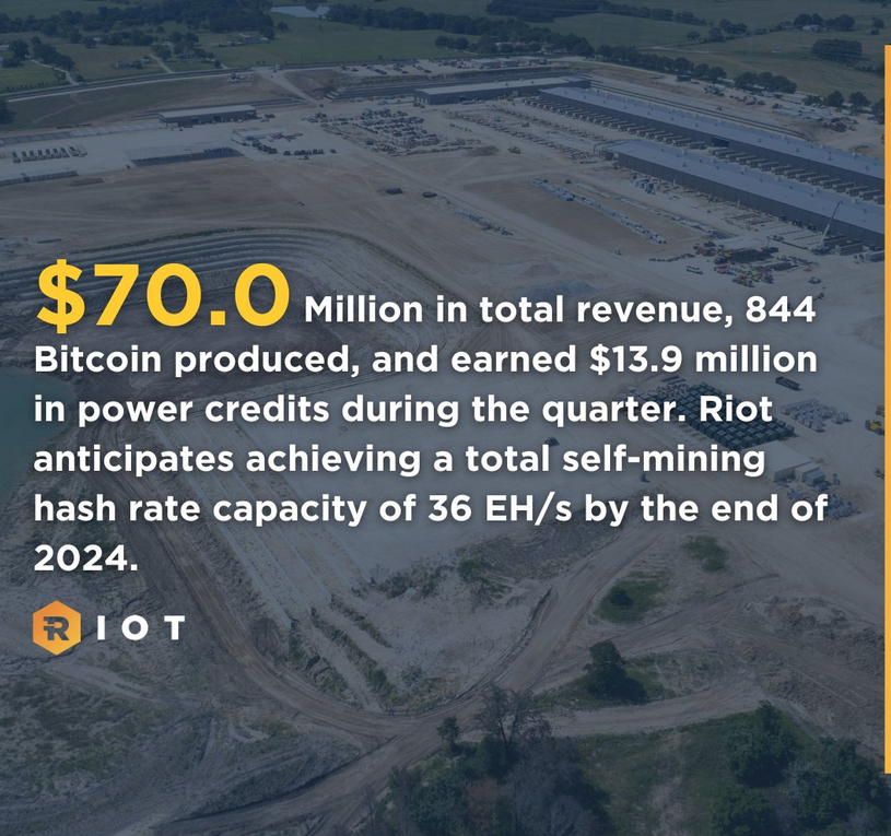 Riot cũng gần như đã gấp đôi tỷ lệ băm đã cài đặt lên 22 exahash mỗi giây trong quý 2 và kỳ vọng khả năng tỷ lệ băm tự khai thác của công ty sẽ đạt 36 EH/s trước cuối năm 2024.