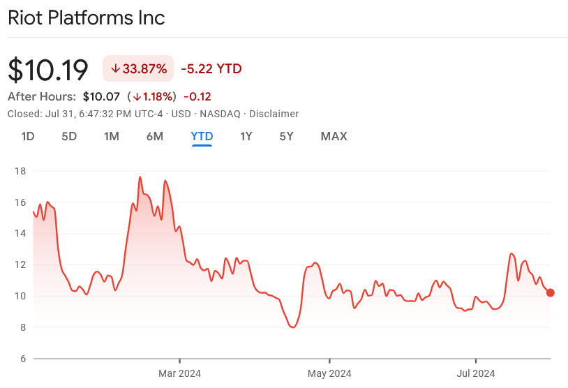 Biến động giá cổ phiếu Riot cho đến nay trong năm 2024. Nguồn: Google Finance