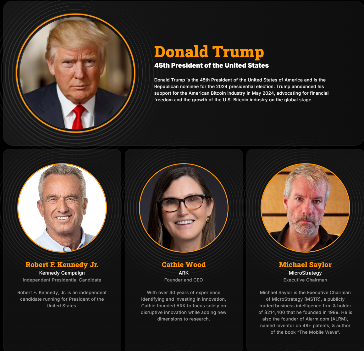 Các diễn giả tại Bitcoin 2024 bao gồm hai ứng cử viên tổng thống Mỹ. Nguồn: BTC Inc