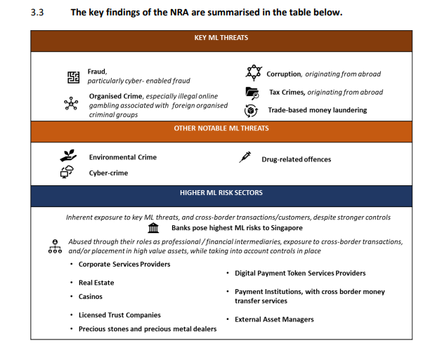 Thách thức mới nhất đối với các nền tảng crypto xuất hiện chỉ vài tuần sau khi một báo cáo chỉ ra rằng các mã thông báo thanh toán kỹ thuật số là đối tượng có rủi ro cao. Theo Đánh giá Rủi ro Quốc gia về Rửa tiền (MLNRA) mới nhất của Singapore, các nhà cung cấp dịch vụ DPT đại diện cho các rủi ro và điểm yếu nghiêm trọng trong bối cảnh Chống Rửa tiền (AML).