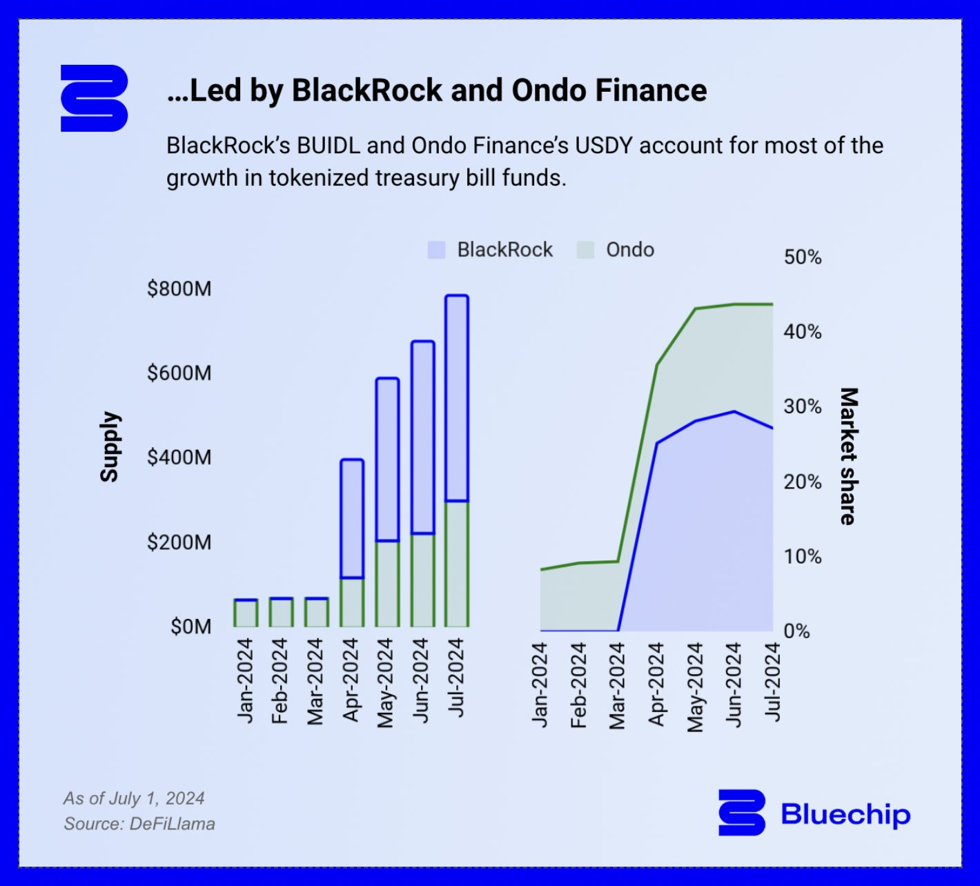 Biểu đồ hiển thị thị phần của USDY và BUIDL trong các sản phẩm trái phiếu chính phủ token hóa. Nguồn: Bluechip