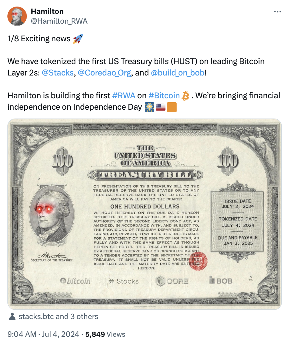 Trái phiếu Kho bạc Hoa Kỳ tokenized (HUST) sẽ được cung cấp trên các giải pháp layer-2 của Bitcoin như Stacks, Core và BoB (Build on Bitcoin). Giao dịch đầu tiên với HUST đã diễn ra vào ngày 4 tháng 7, theo thông cáo báo chí.
