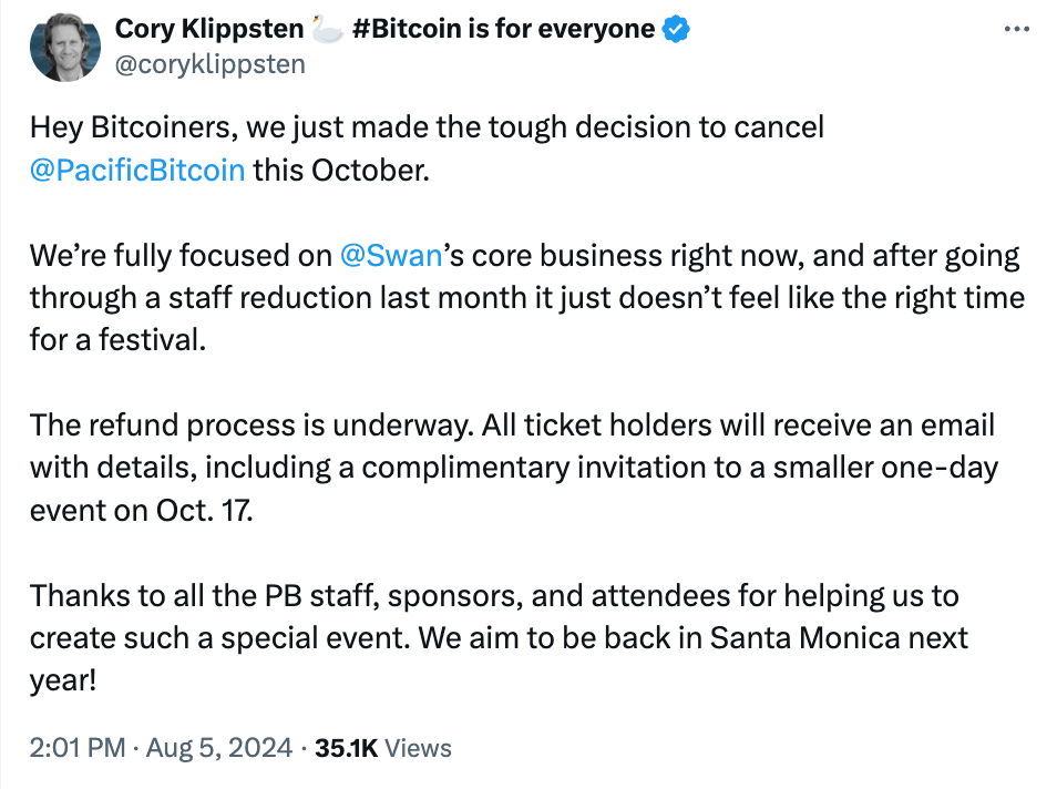 Trong một bài đăng trên X vào ngày 5 tháng 8, Cory Klippsten thông báo rằng công ty sẽ không tổ chức Pacific Bitcoin Festival vào năm 2024. Sự kiện này, dự kiến diễn ra tại Santa Monica, California từ ngày 18 đến 19 tháng 10, còn khoảng hai tháng nữa thì bị hủy bỏ.