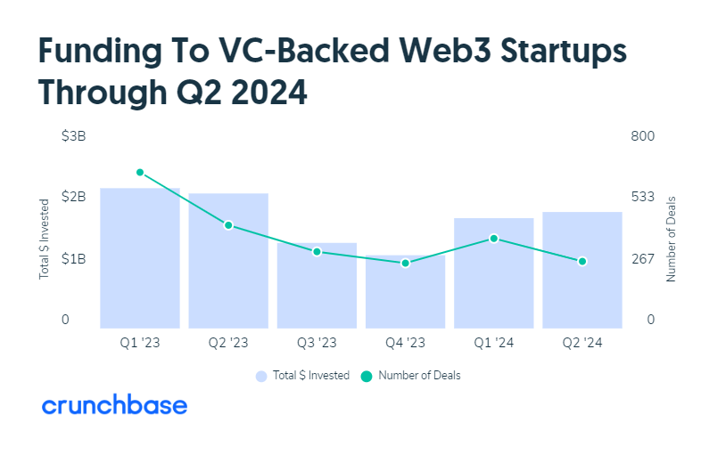 Tài trợ đầu tư cho các startup Web3 đang dần ổn định sau một năm giảm sút kéo dài từ năm 2023, với các dự án crypto thu hút khoảng 2 tỷ USD trong quý 2 năm 2024, theo Crunchbase.