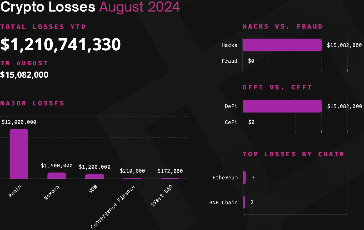 Mặc dù tài chính phi tập trung (DeFi) chiếm toàn bộ các vụ tấn công trong tháng 8, tài chính tập trung (CeFi) vẫn là điểm yếu lớn nhất đối với bảo mật crypto.
