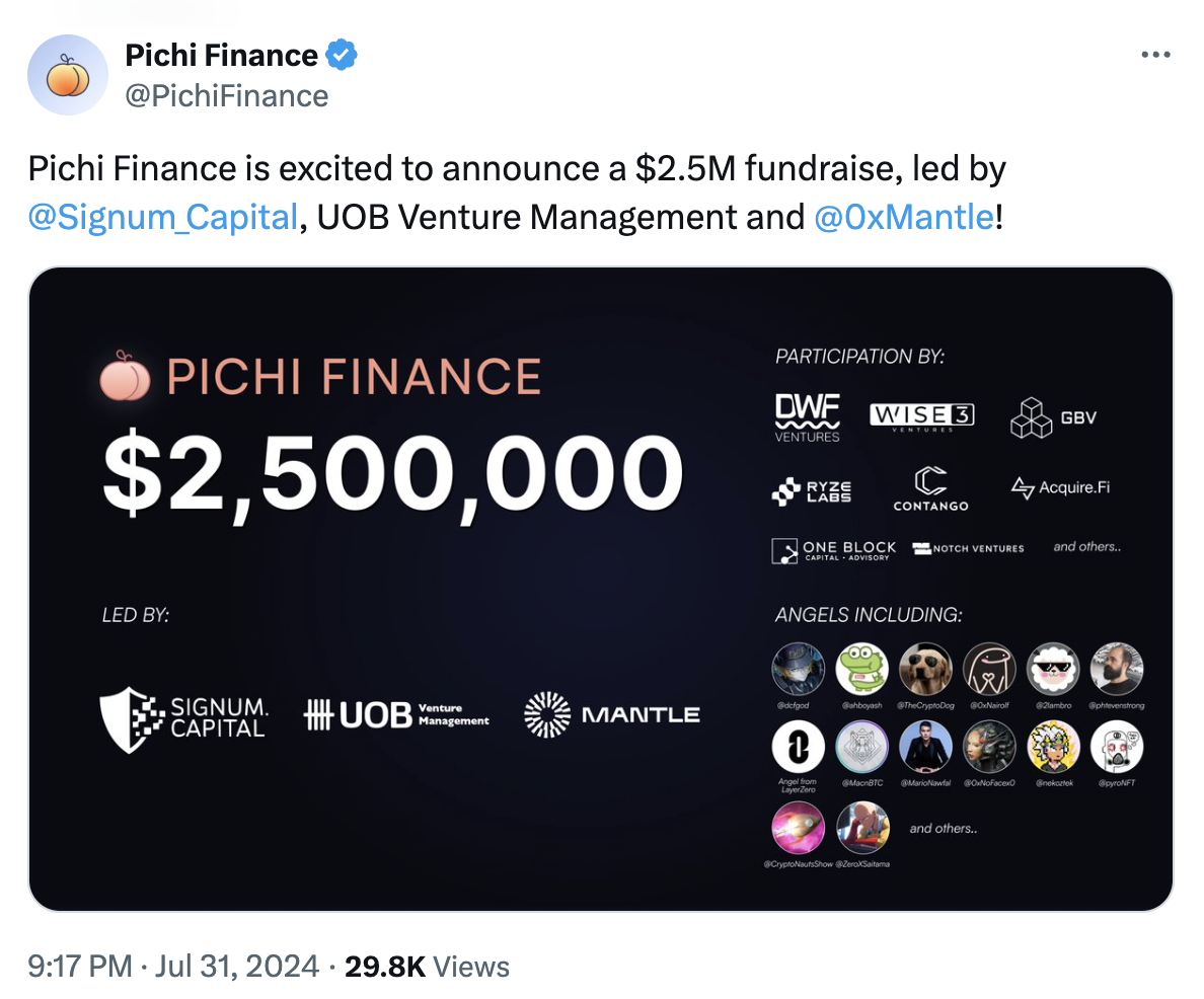 Pichi Finance đã hoàn thành vòng đầu tư tiền hạt giống trị giá 2,5 triệu USD do UOB Venture Management, Signum Capital và Mantle Network dẫn đầu. Startup này là một giao thức giao dịch điểm không cần tin cậy, cho phép người dùng giao dịch điểm tích lũy từ các giao thức như EigenLayer, Ether.Fi và HyperLiquid. Các nhà đầu tư khác bao gồm DWF Ventures, Wise3 Ventures và Genesis Block Ventures. Pichi sử dụng tiêu chuẩn token ERC-6551 để cho phép tạo ra NFTs Michi Wallet, ký gửi token và giao dịch các NFTs cùng với các điểm tích lũy. Theo startup, mô hình này cho phép giao dịch mà không cần tài sản thế chấp từ người mua hoặc người bán.