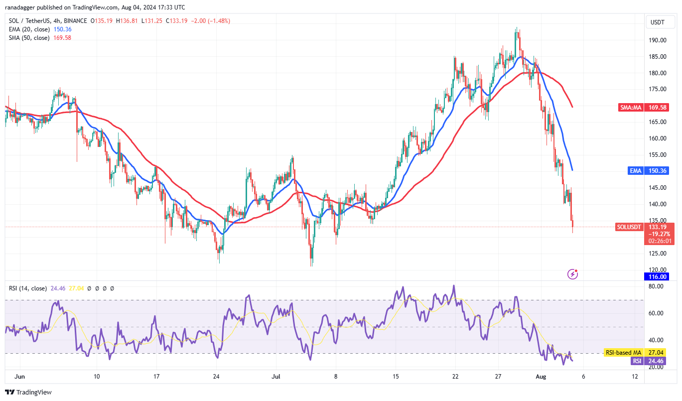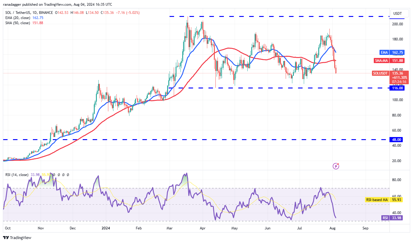 Các phe gấu đã kéo giá xuống dưới các đường trung bình động, nhưng cặp SOL/USDT có thể tìm thấy hỗ trợ trong vùng từ $127 đến $116. Nếu giá hồi phục từ mức hiện tại hoặc vùng hỗ trợ, nó có thể đối mặt với sự bán ra tại đường EMA 20 ngày ($162).