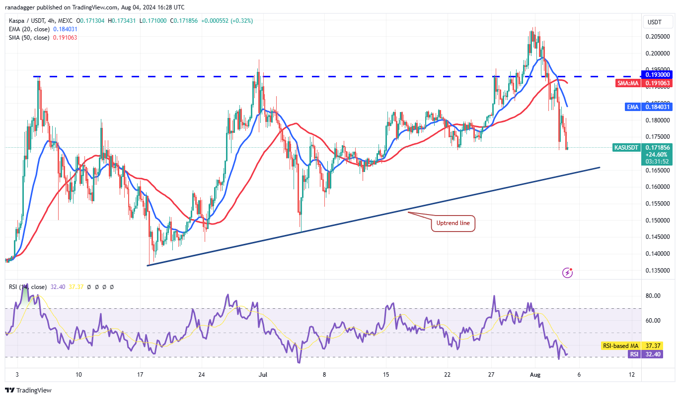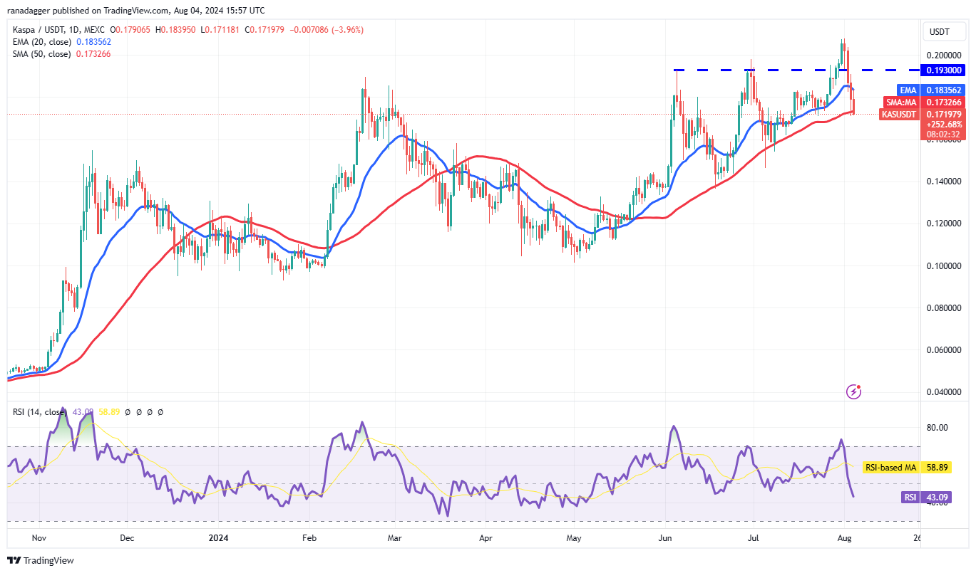 Kaspa (KAS) giảm mạnh từ $0.21 vào ngày 1 tháng 8, nhưng phe bò đang cố gắng tìm hỗ trợ tại SMA 50 ngày ($0.17).