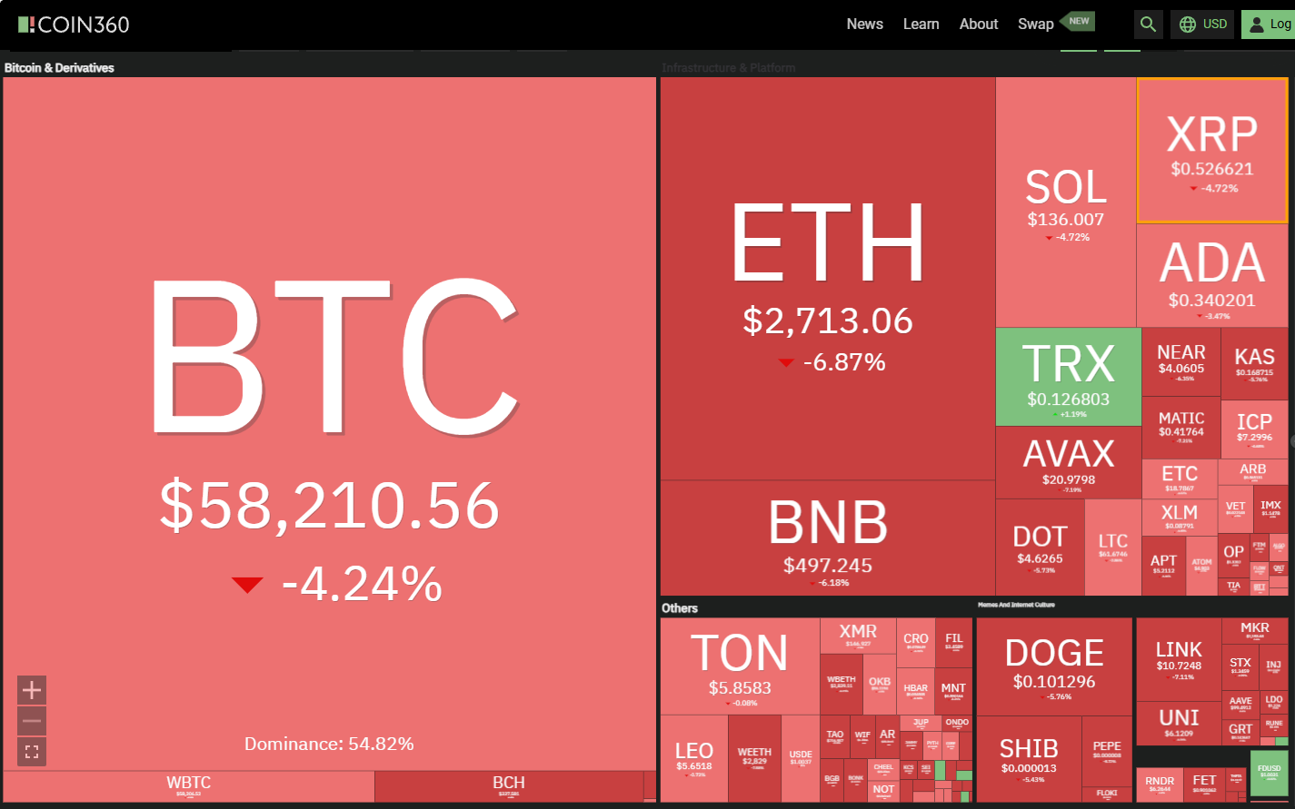 Bitcoin (BTC) đang trong tình trạng giảm mạnh, xuyên thủng mức hỗ trợ tâm lý $60,000 vào ngày 4 tháng 8. Bitcoin chịu áp lực bán mạnh trong tuần này khi các nhà giao dịch giảm rủi ro sau khi chỉ số chứng khoán Nhật Bản Nikkei giảm khoảng 6% vào ngày 2 tháng 8. Báo cáo việc làm yếu kém hơn mong đợi vào ngày 2 tháng 8 không giúp cải thiện tình hình và Nasdaq Composite đã rơi vào vùng điều chỉnh, giảm hơn 10% so với mức cao kỷ lục.