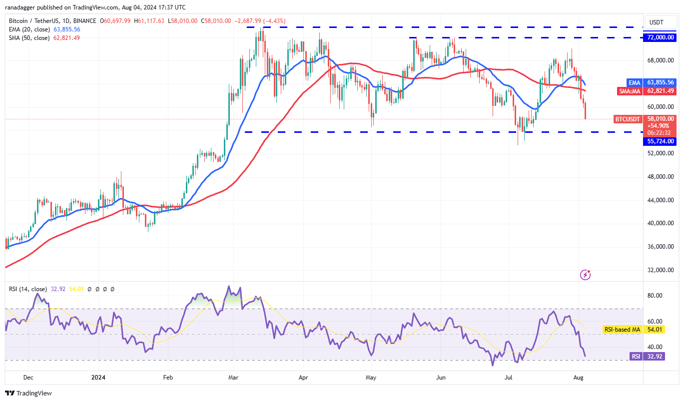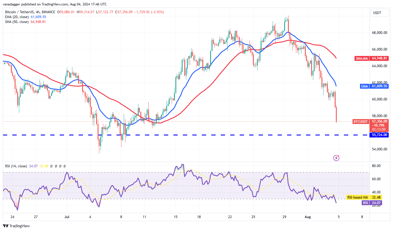 Bitcoin đang chứng kiến áp lực bán mạnh kể từ khi phá vỡ các đường trung bình động vào ngày 2 tháng 8. Cú giảm mạnh đã cắt xuyên qua mức hỗ trợ $60,000 vào ngày 4 tháng 8.