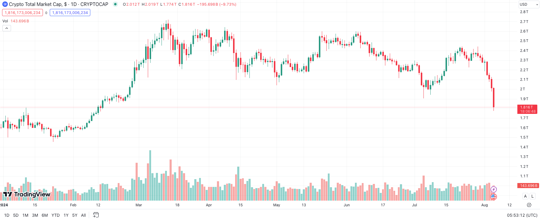 Thị trường crypto vừa ghi nhận đợt bán tháo lớn nhất trong ba ngày qua trong hơn một năm, với vốn hóa thị trường tổng cộng giảm tạm thời lên tới $510 tỷ kể từ ngày 2 tháng 8.