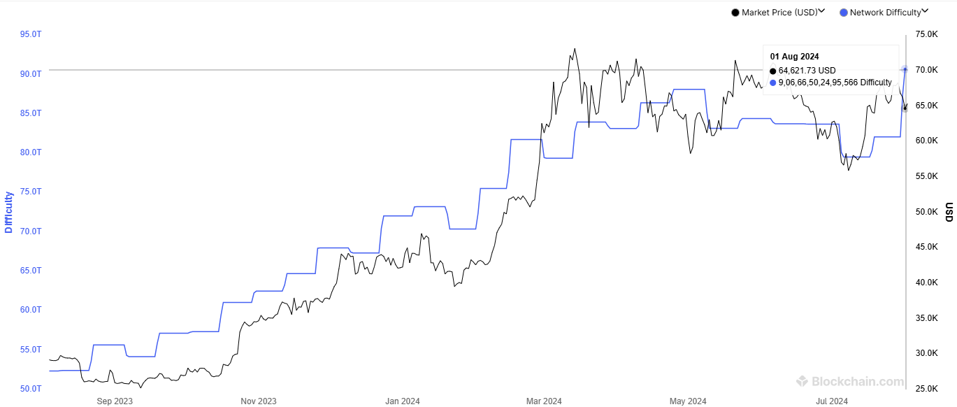 Tuy nhiên, độ khó mạng lưới đã tăng vọt vào ngày 31 tháng 7 và cuối cùng đánh dấu mức cao nhất mọi thời đại vào ngày 1 tháng 8 ở mức 90.66 triệu. Độ khó tăng 14%, dự kiến sẽ ảnh hưởng tiêu cực đến thu nhập của các thợ đào trong thời gian tới.