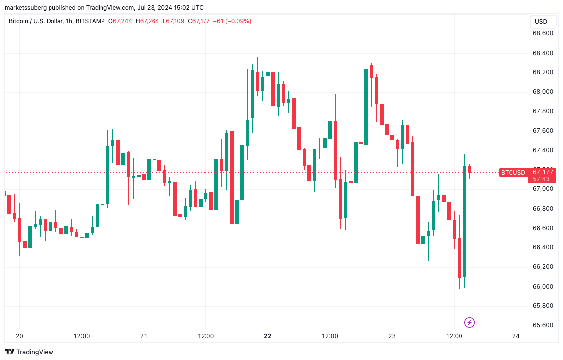 Trong khi đó, Bitcoin đã phục hồi từ mức giảm ban đầu của nó, lấy lại mức 67.000 USD.
