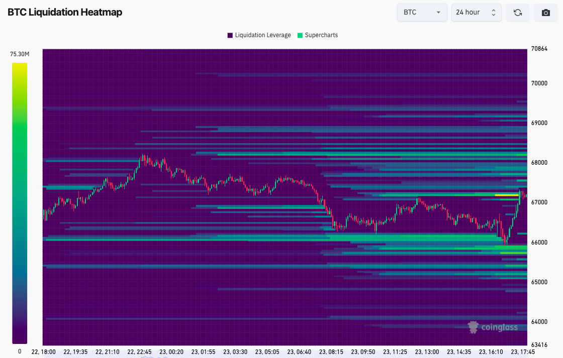 Dữ liệu mới nhất từ nguồn giám sát CoinGlass cho thấy một khu vực thanh khoản người mua mới đang xuất hiện ở mức 65.750 USD, trong khi áp lực bán phía trên cũng gia tăng.