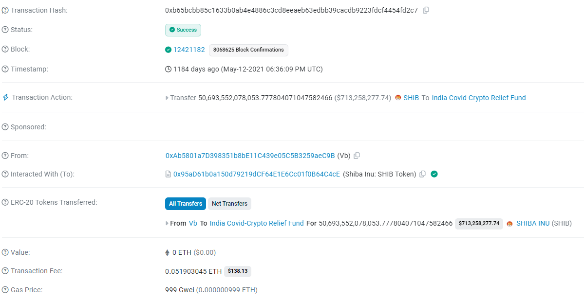 Khoản quyên góp SHIB trị giá 1 tỷ đô la của Buterin. Nguồn: Etherscan